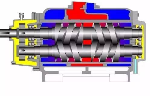 它主要是由固定在泵體中的襯套(泵缸)以及安插在泵缸中的主動螺桿和與其嚙合的兩根從動螺桿所組成。三根互相嚙合的螺桿,在泵缸內(nèi)按每個導(dǎo)程形成為一個密封腔,造成吸排口之間的密封。